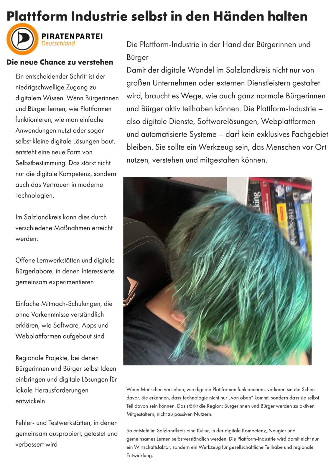 Die Plattform‑Industrie – also digitale Dienste, Softwarelösungen, Webplattformen und automatisierte Systeme – darf kein exklusives Fachgebiet bleiben. Sie sollte ein Werkzeug sein, das Menschen vor Ort nutzen, verstehen und mitgestalten können.