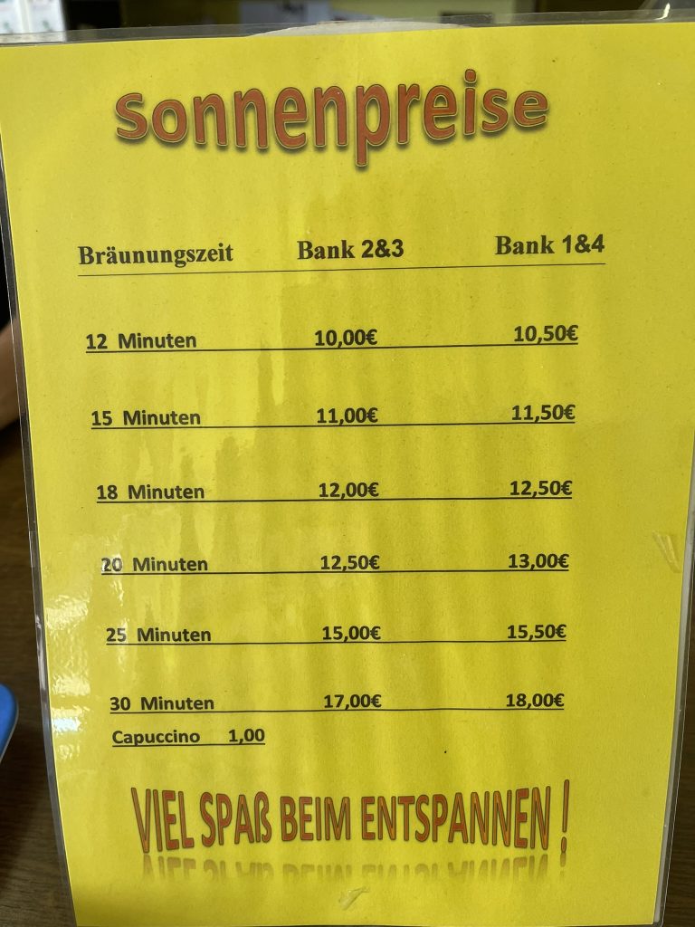 Während er wartete, wanderte sein Blick über die Regale: Cremes in allen Farben, glänzende Fläschchen, die versprachen, die Haut zu pflegen wie ein Schatz, den man nicht verlieren will. Und natürlich der Cappuccino, der in diesem Solarium fast so wichtig war wie die Sonnenbänke selbst. Viele kamen nicht nur zum Bräunen, sondern auch zum kurzen Entfliehen – ein paar Minuten Wärme, ein paar Schlucke Milchschaum, ein bisschen Ruhe.