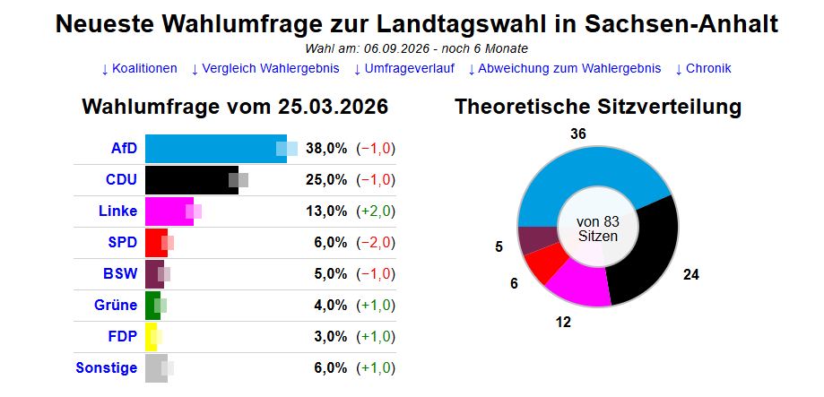 Briefwahlen Landtagswahlen, Piraten März 2026 Neueste Wahlumfrage zur Landtagswahl in Sachsen-Anhalt. März 28, 2026 / No Comments Neueste Wahlumfrage zur Landtagswahl in Sachsen-Anhalt.