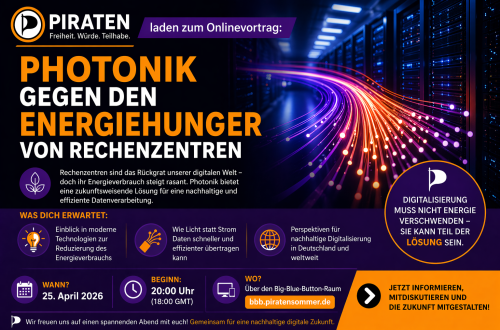 PIRATEN laden zum Onlinevortrag: Photonik gegen den Energiehunger von Rechenzentren. Der Vortrag findet am 25. April 2026, ab 20:00 Uhr (18:00 GMT) statt. Über den Big‑Blue‑Button‑Raum unter bbb.piratensommer.de gelangt man zum Vortrag.